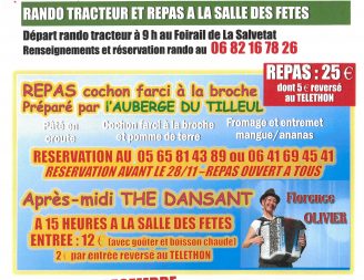 SALLE DES FETES : Réservez votre déjeuner chou farci ou gras double auprès de l'Auberge du Tilleul au 05 65 81 43 89. 5€ par repas reversé au TELETHON